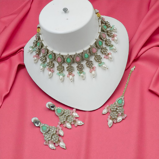 Pearl Drop Choker Jewellery Dangle Earrings Set - Mint-Pink