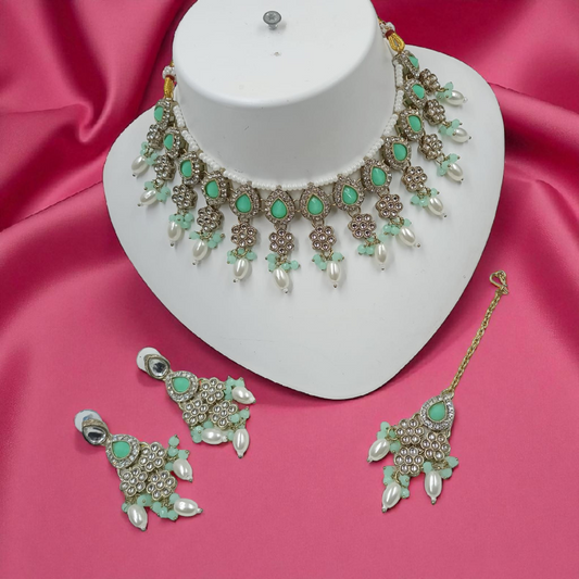 Pearl Drop Choker Jewellery Dangle Earrings Set - Sea-green